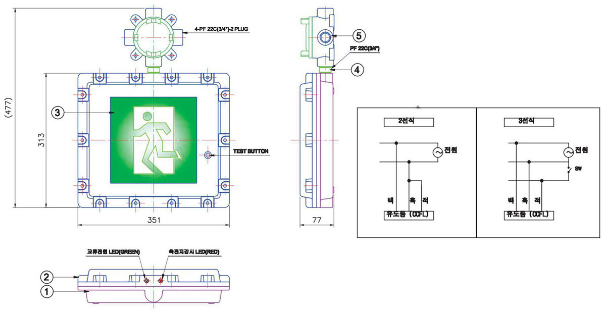 | 형식 | AC 220V, DC 3.6V, 단면형, 돌출형, LED식, 방폭형, 유효점등시간 60분, 피난구, 중형 |